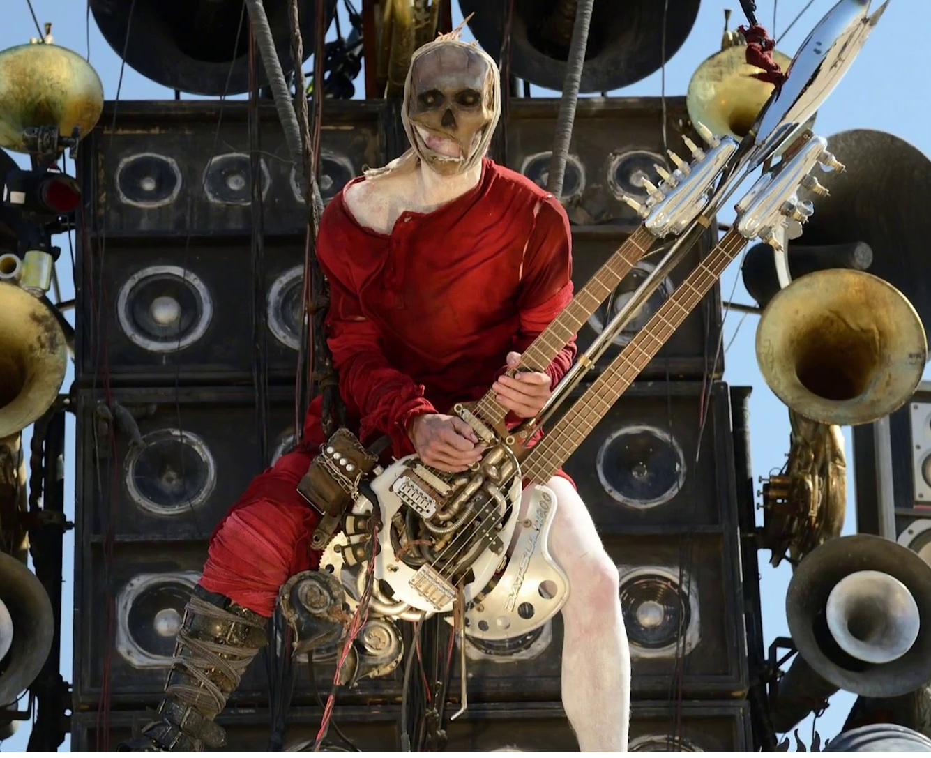“The first version of the guitar – I think I put too much into the flamethrower, not enough into the reverb,” Colin Gibson, the production designer for the film, told MTV. “And yes, the flame-throwing guitar did have to operate, did have to play, the PA system did have to work.”